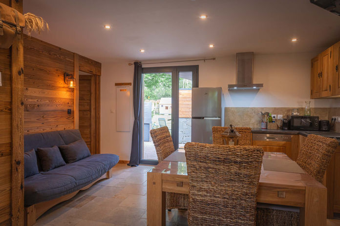 Cuisine ouverte sur salle à manger avec TV, une chambre d'un lit 2 places (linge de lit fournit) avec TV et liseuses, une salle d'eau et WC indépendant.